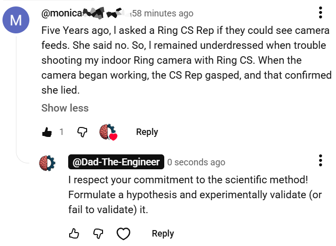 The result was getting 124 thumbs down. And I could see each one of them in the comments - all with some variation of: “you were wrong to list my camera brand!”. Except I wasn’t. Even for those that record locally, and don’t have a subscription, basically none of them engaged with me after I pointed out the vulnerability of them using the vendor app to look in on their system when away from home. Yep - if YOU can see your system, the VENDOR CAN, TOO! (ps. the video got over 13k likes)